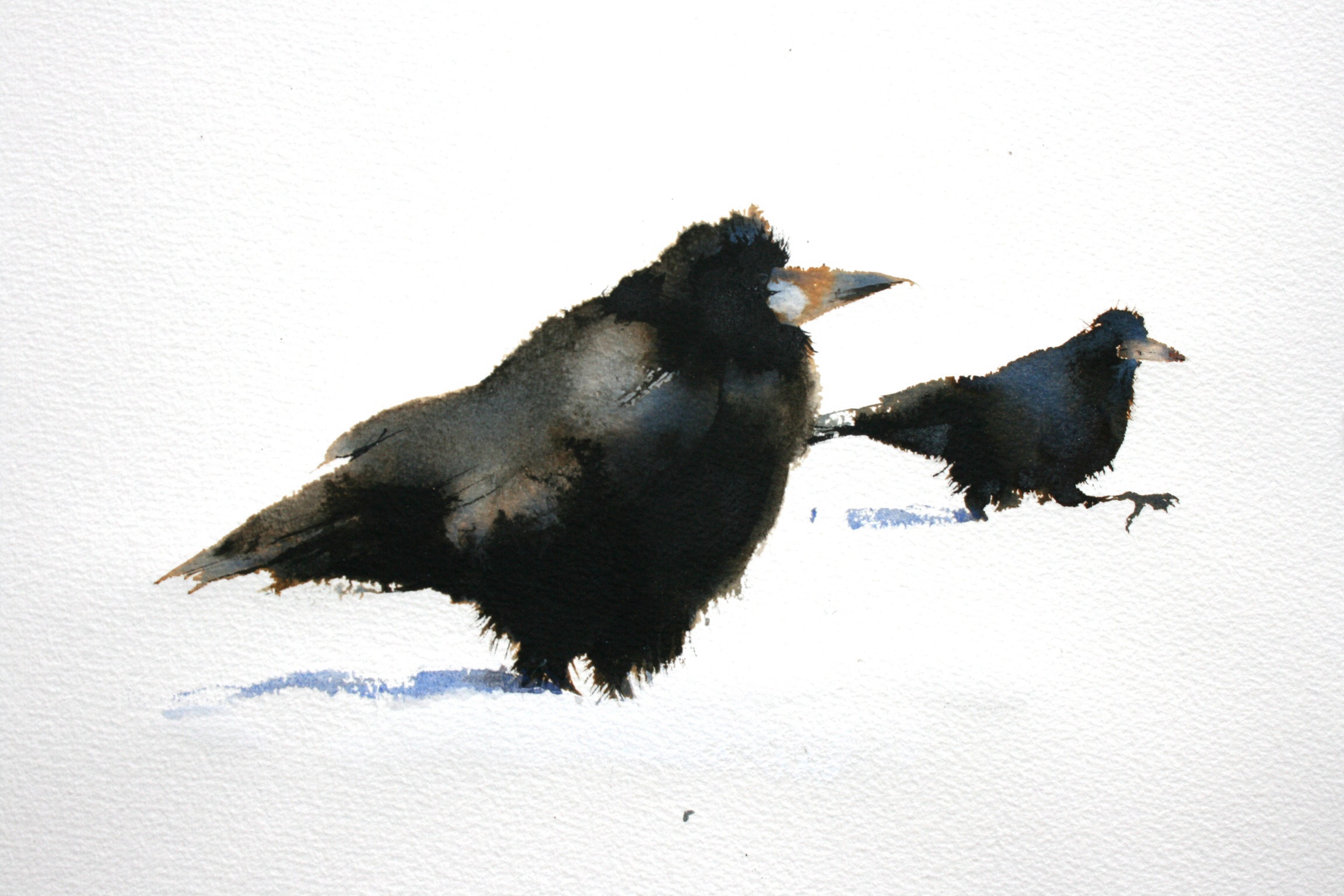 Fledgling RookrookI’ve recently read a couple of wonderful books about the highly intelligent corvids, ‘Crow Country’ by Mark Cocker, and ‘Corvus’ by Esther Woolfson, which inspired me to paint them, using Indian ink, quink, and black gouache, with brushes, pens and occasionally a stick. They look as dramatic against the snow as they look eerie at dusk, and make a great ink/watercolour subject.