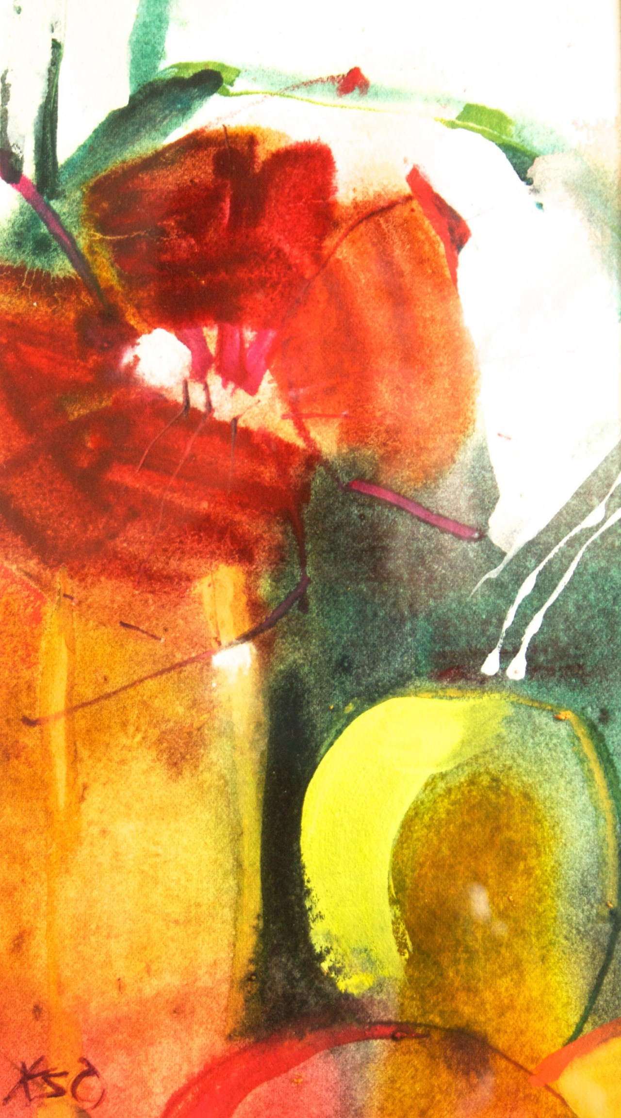 After taking a first pull you can re paint your image and do another print from it, the results are very different, the second painting faster, the painting therefore wetter and the print usually richer with less ‘broken’ areas. This print has then been painted back into, defining the lemon, the jug handle, and the centre of the flowers.