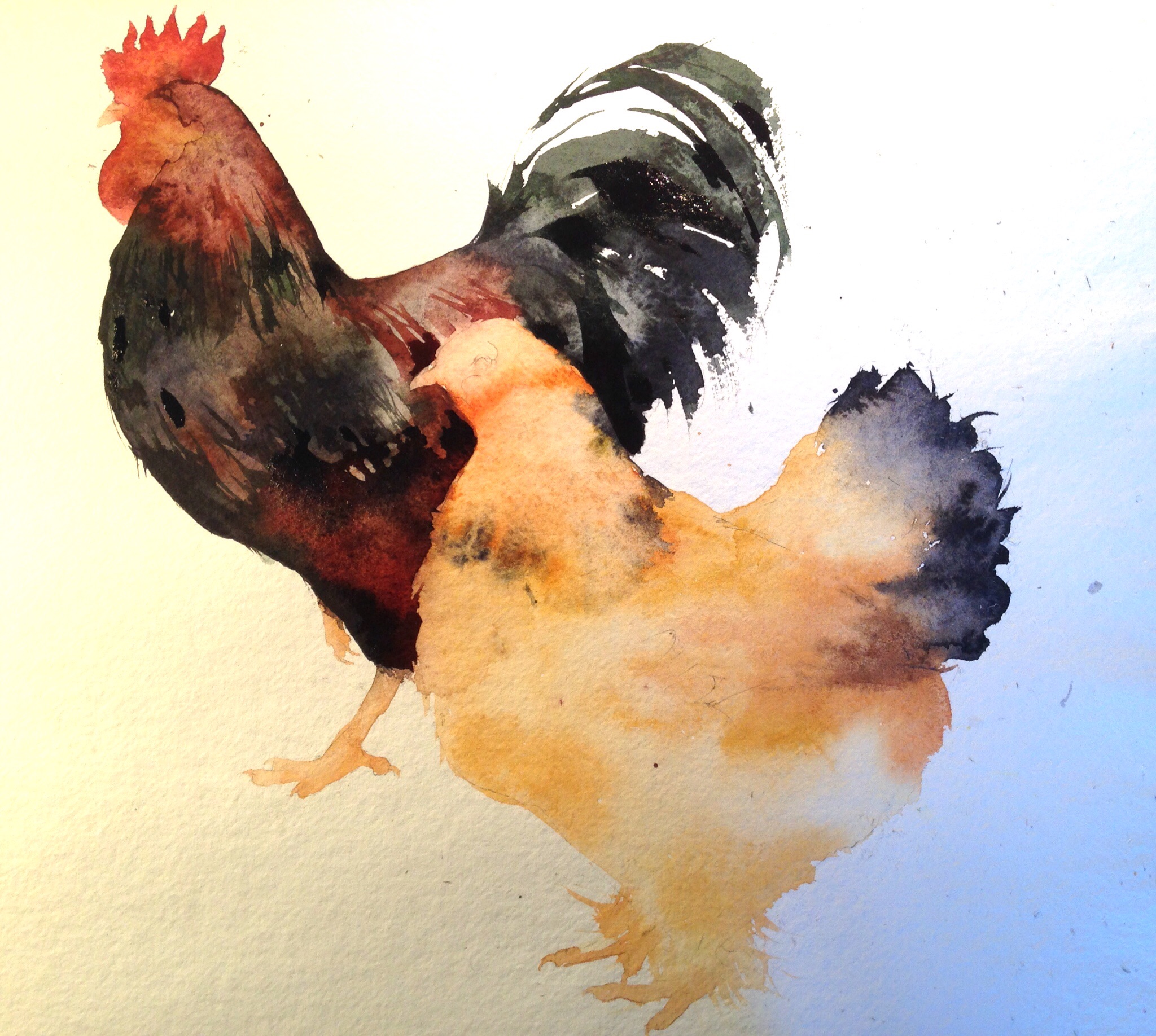 This painting was commissioned by a mum for her daughter’s birthday, who a few years ago had these two breeds as much loved pet chickens. Commissions always make me nervous, but it went well, possibly on account of having painted a books worth of them for Ivy Press last year. As usual I get absorbed and forget to photograph enough stages of the painting. By the way if anyone wants a painting of a specific breed, I’m your girl!