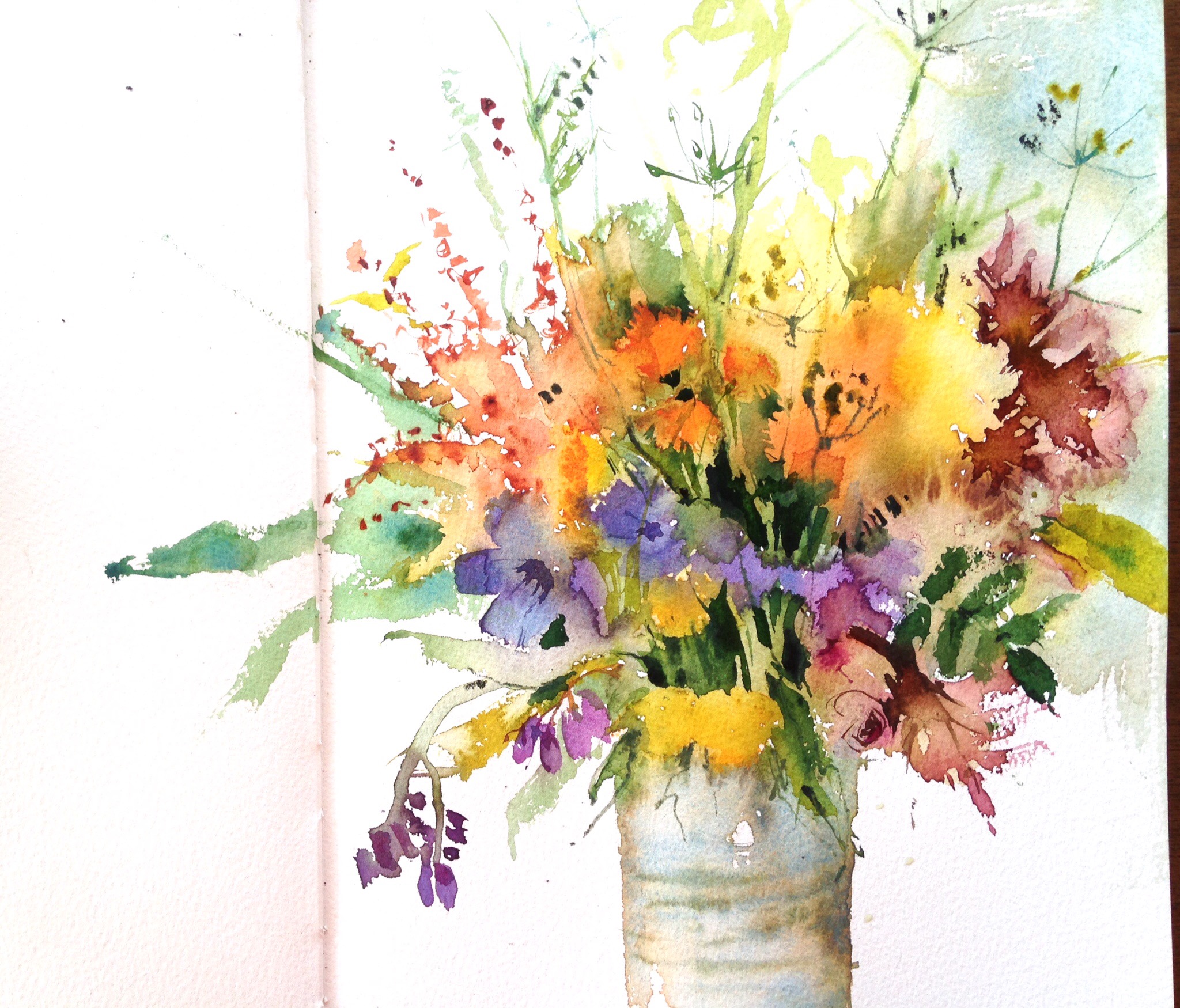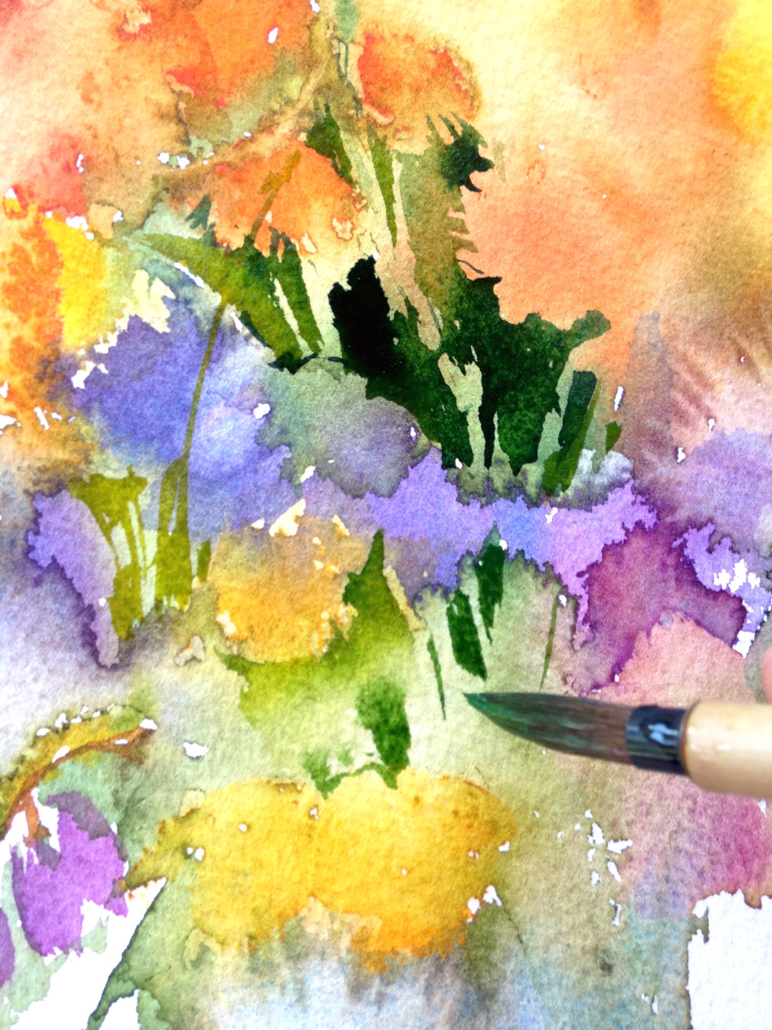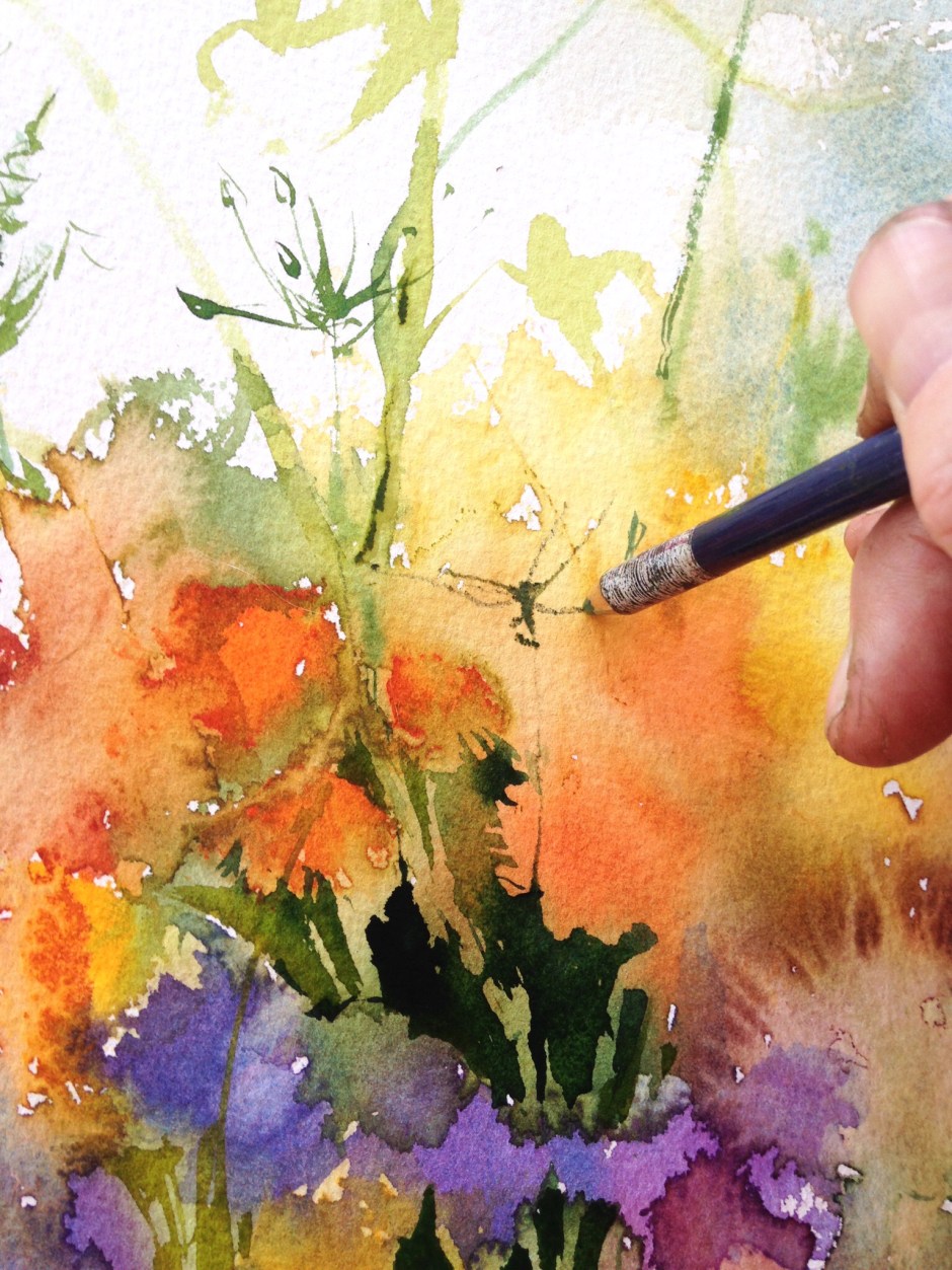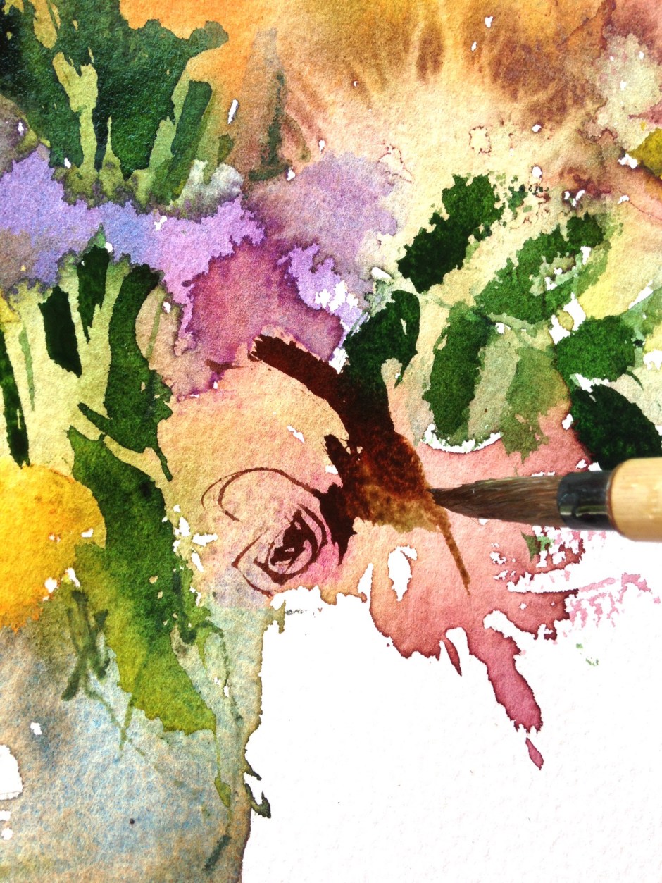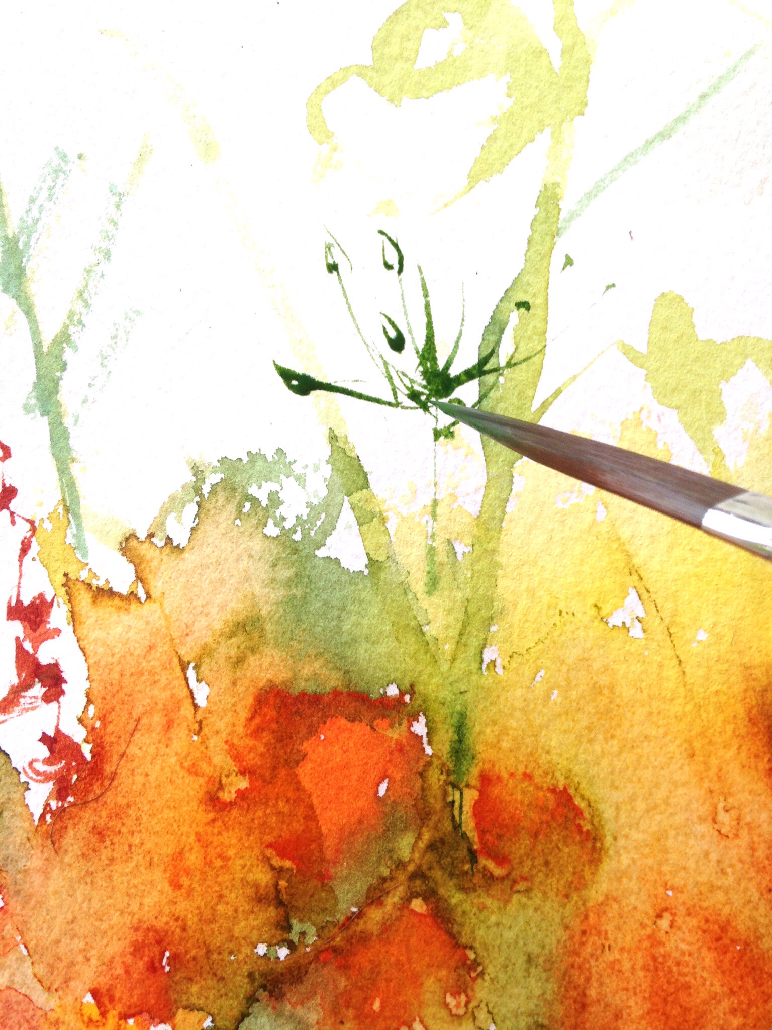 The next stage I start finding the shapes of flowers and foliage in deeper tones, and by painting both positive shapes like the rose leaves on the right, and negative shapes, defining the stalks in the middle. At this point I’ll also start using coloured pencils and watercolour sticks. I like Derwents Inktense and Daniel Smiths watercolour sticks, both very rich and vibrant colours that work well into both dry and wet areas