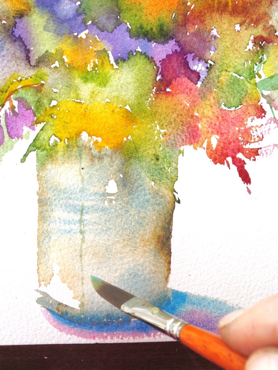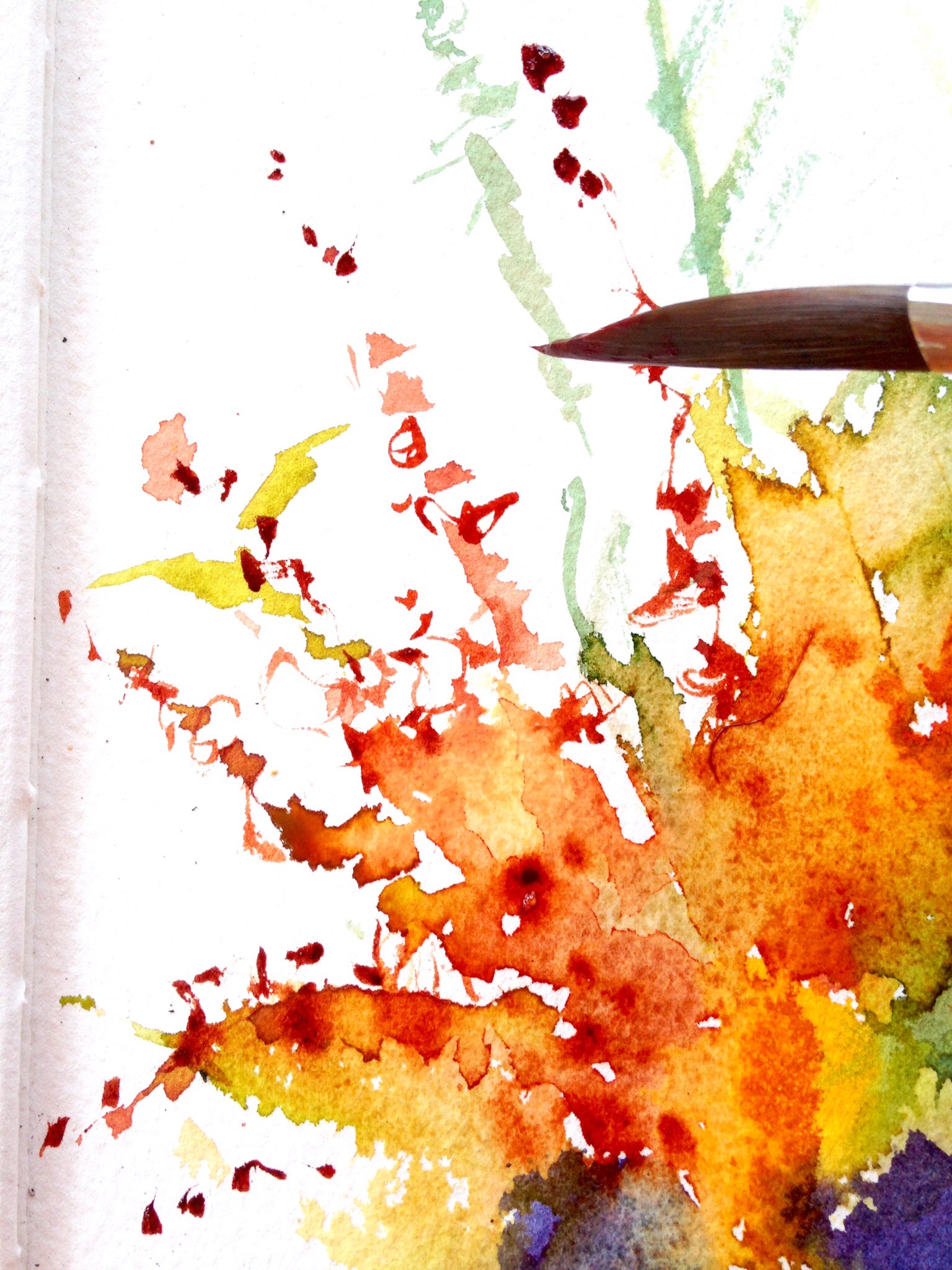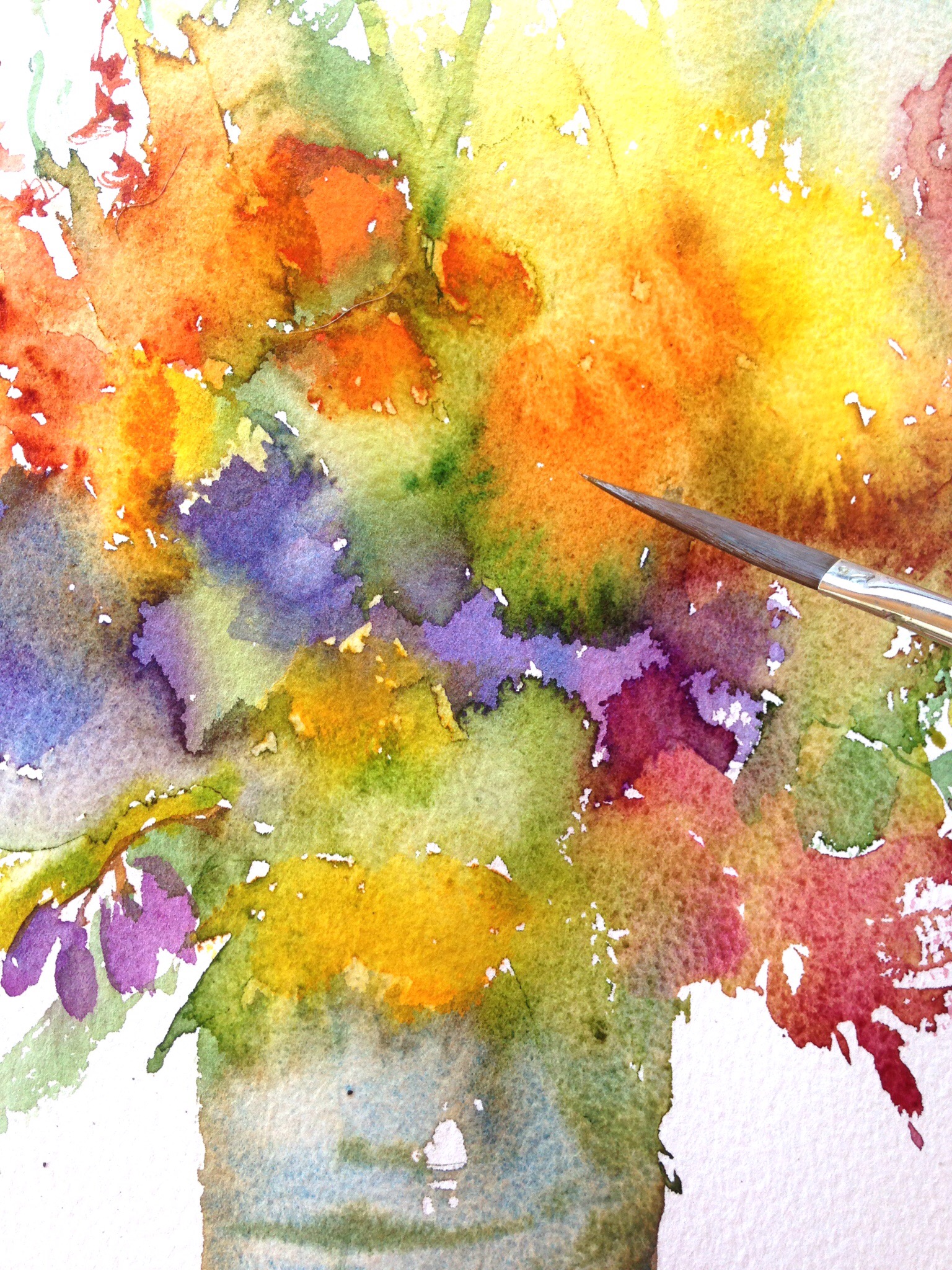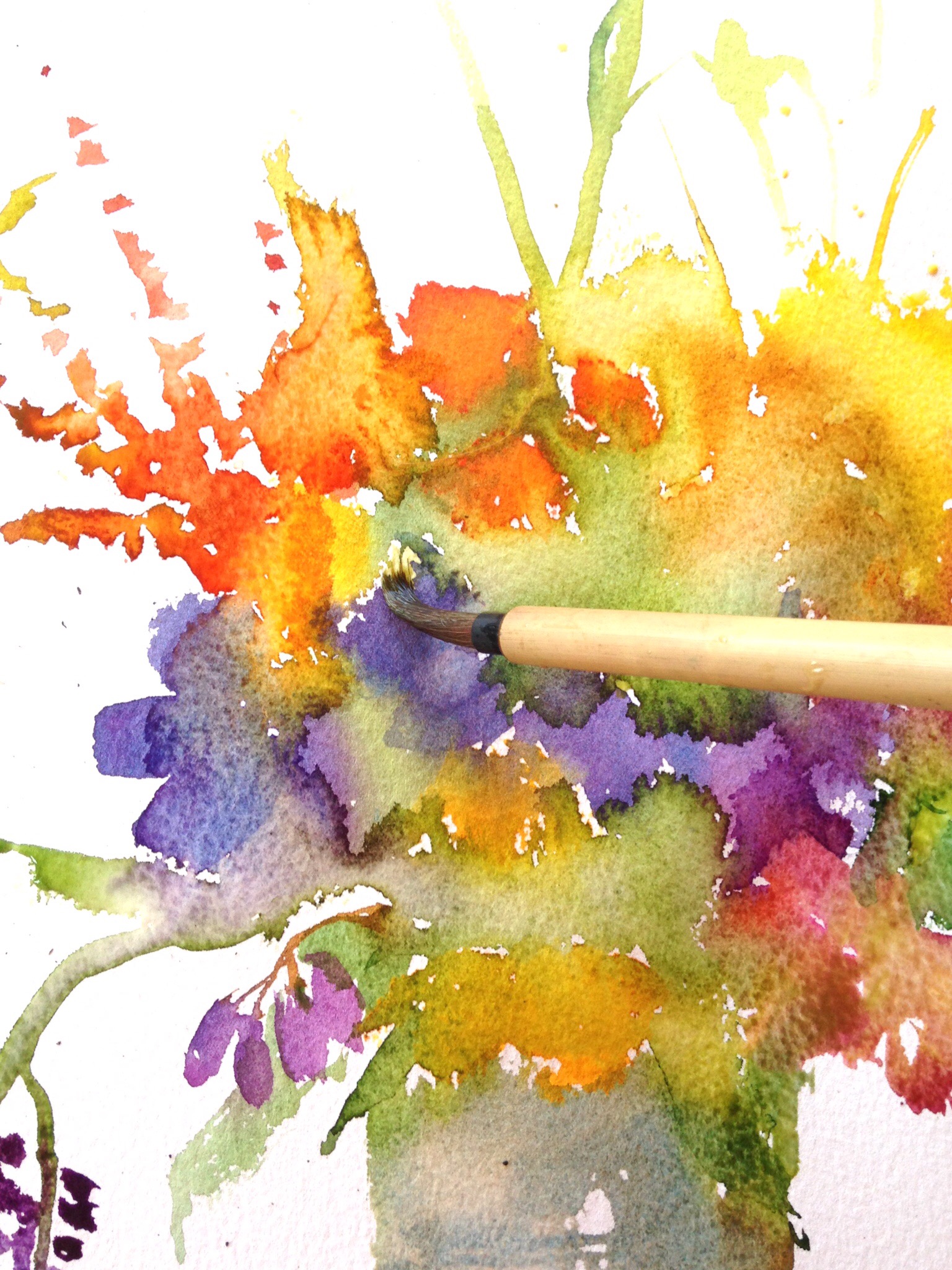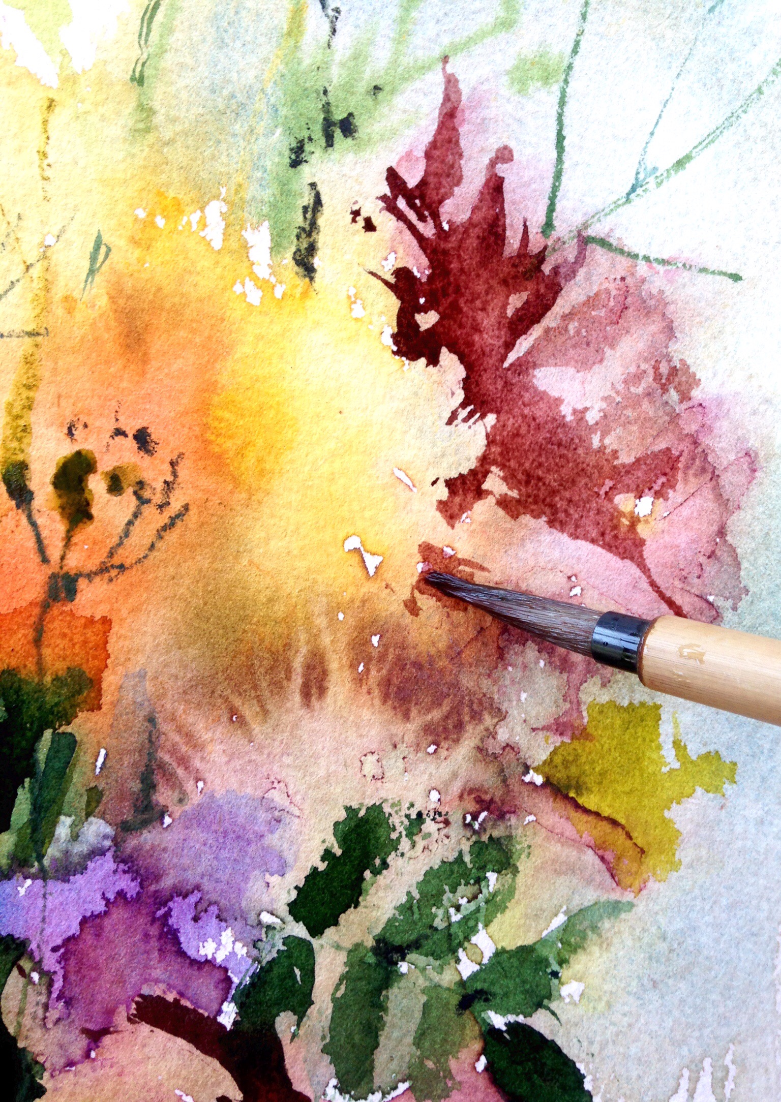 The next stage I start finding the shapes of flowers and foliage in deeper tones, and by painting both positive shapes like the rose leaves on the right, and negative shapes, defining the stalks in the middle. At this point I’ll also start using coloured pencils and watercolour sticks. I like Derwents Inktense and Daniel Smiths watercolour sticks, both very rich and vibrant colours that work well into both dry and wet areas