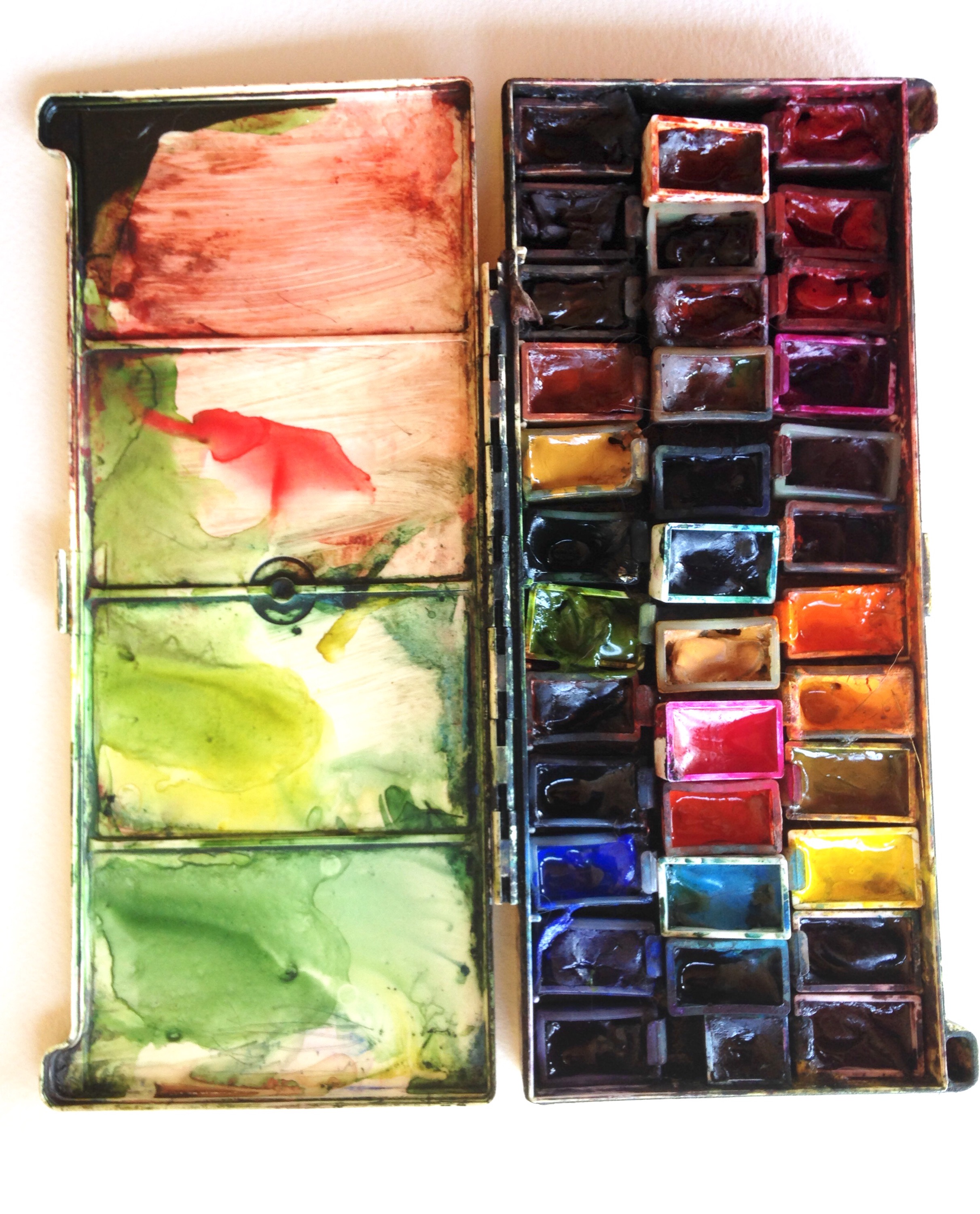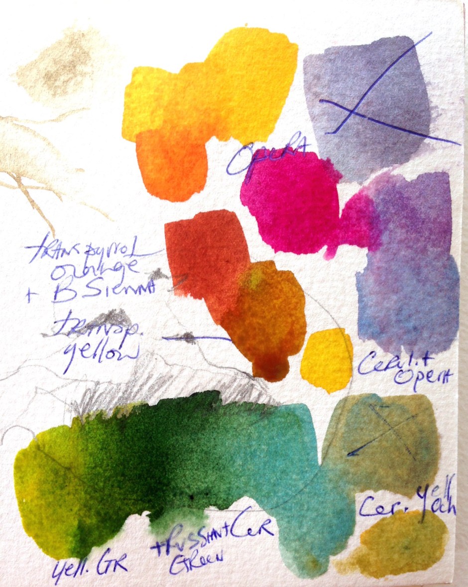Green, green yellow, cerulean, yellow ochre, transparent pyrrol Orange (Daniel Smith, gorgeous colour) transparent yellow, burnt sienna, opera pink, cobalt blue, indigo.