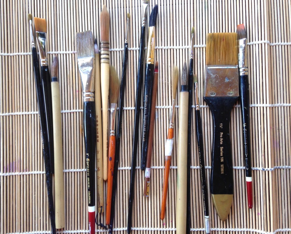 First stages done with a chinese brush (goats hair?) and a Prolene sword brush, have tried a badger hair sword brush but found it too soft. The paint is mixed plenty wet, I want to keep it moving and not risk edges drying too fast as I work, particularly on a hot day. I would have used water spray but forgot to take it with me.