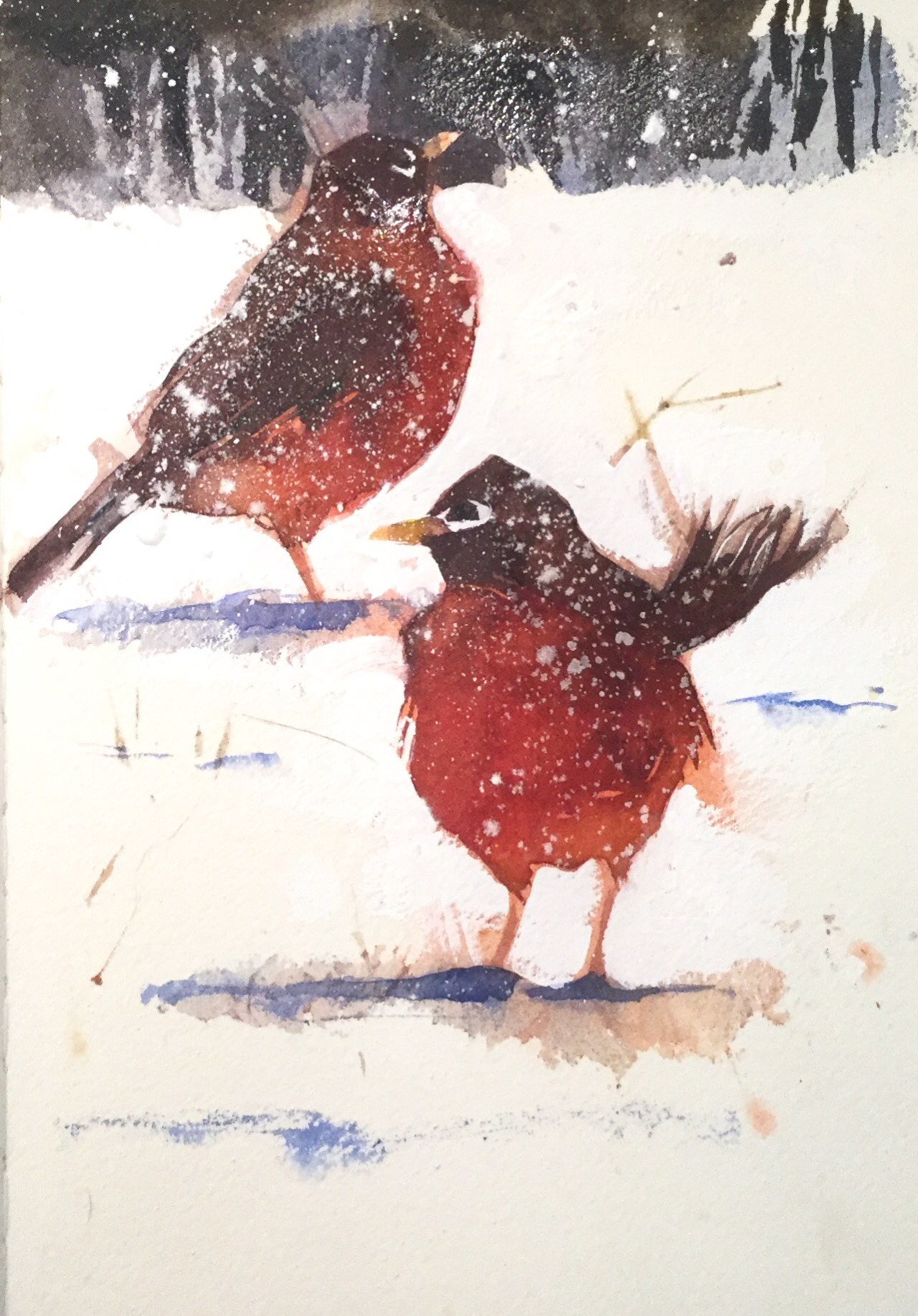 Here the paper is left white for the snow, shadows added in cobalt blue. The white around the eyes and the falling snow is white gouache, thicker and more opaque than watercolour. The falling snow is applied from a toothbrush, dragging the nail across the bristles to create splatter