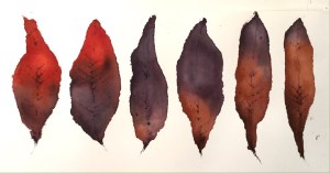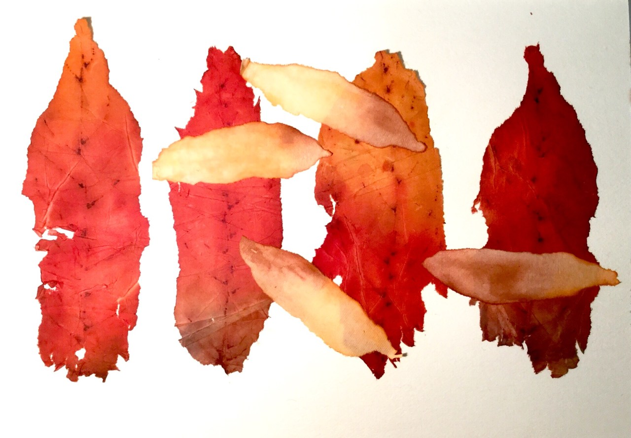 These leaves are part of an allotment project, which is a reason to paint not just the landscape of the particular allotment site where I  have my furlong (and sadly neglected lately) but the natural history it embraces, from frogs and lizards to weeds and foxes. At the moment it’s mainly sketchbook work. I began these leaves by saturating some Chinese bark and cicada wing paper with watercolour, with plenty of pigment; alizarin crimson, ultramarine blue, vandyke brown, quinicridone gold, trans pyrrol orange. Once the paper is dry you can add more watercolour if the tone is too pale, until you’re satisfied with it. I then ‘drew’ the outline of the leaf shapes with a fine brush and water and then tore along these wet lines (both papers are great for this technique). Once stuck down I drew the veins with an inktense pencil, well sharpened!