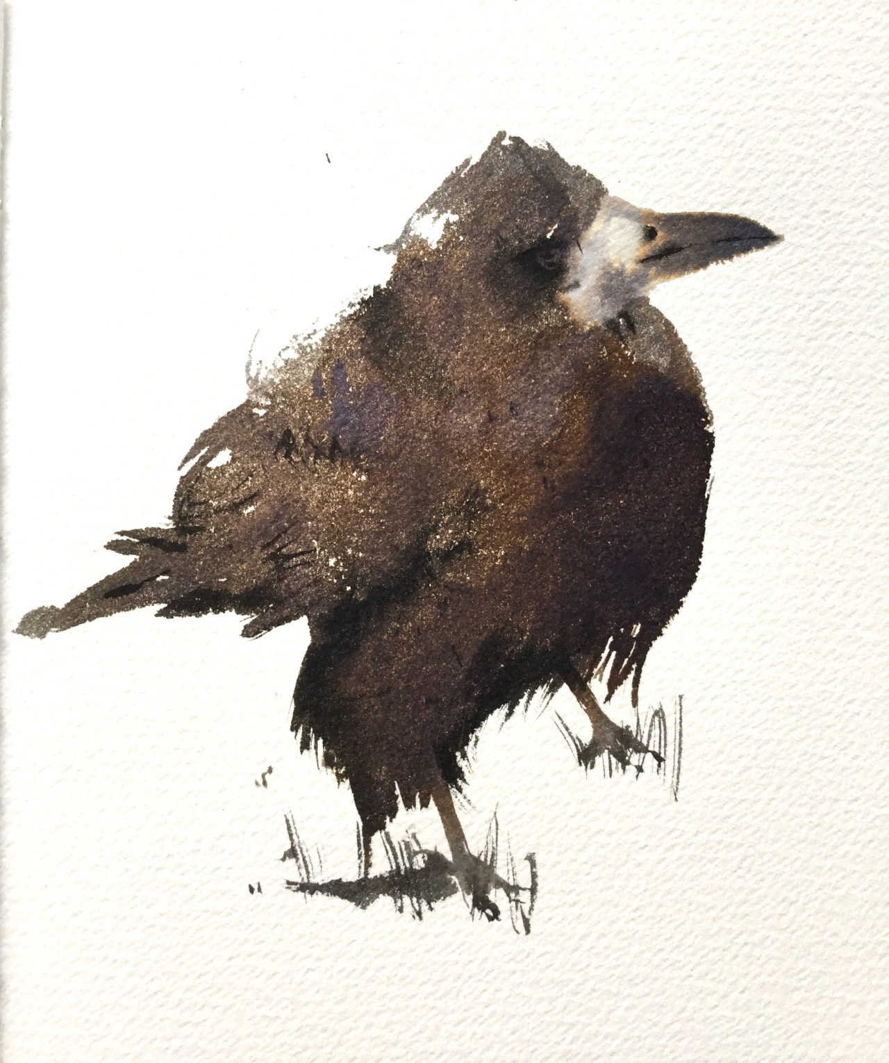 a few more quink and ink (including Indian ink and Waterman brown ink) sketchbook studies of jackdaws, a rook, and parent and chick starlings. The one below started as a monoprint; the way to get thin ink to ‘stay put’ (to a degree at least) on a sheet of acrylic is to sandpaper the surface first. The paper is rough Saunders Waterford so the print image came out fairly broken up, and you can see the rough texture of it through the subsequent painted layer, which I applied right over the printed area, lastly adding the beaks. Worth trying this technique on smoother paper perhaps? The jackdaws have a little green and blue watercolour in them