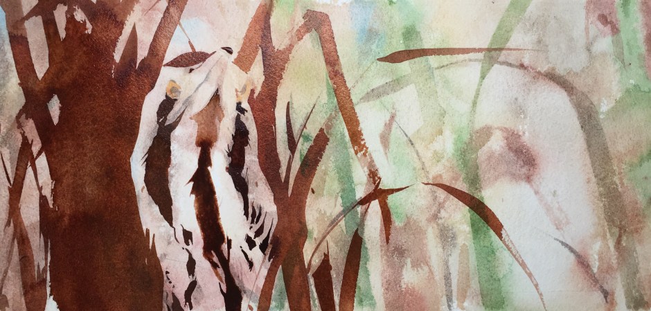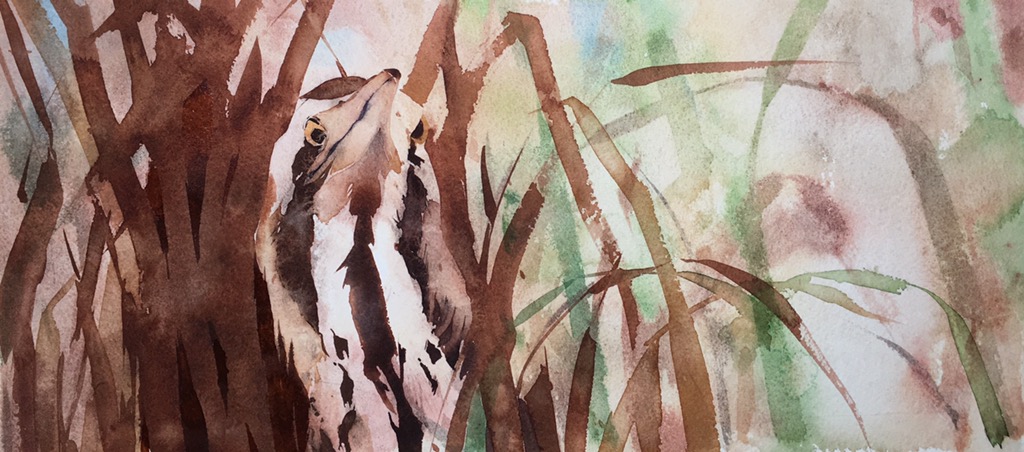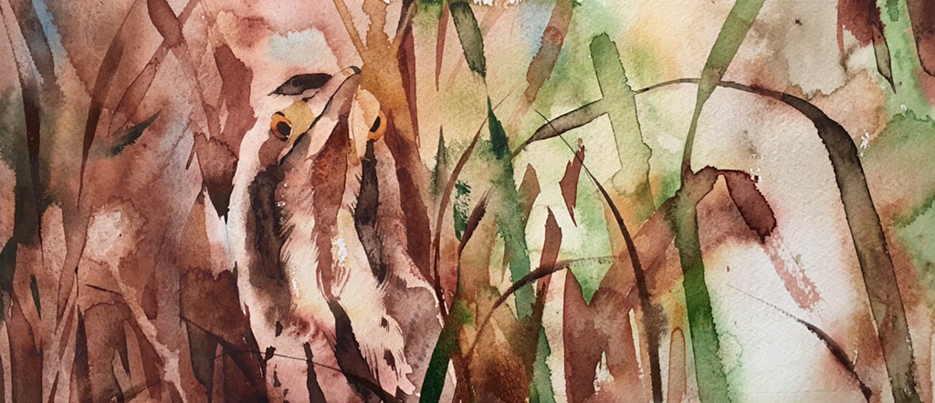 My aim now is to go in with simpler, stronger shapes, less detail, and more confidence. Interestingly, having admitted defeat with the first effort can make you far braver with the second, as there is nothing to lose. The shape of the reeds on the left is painted with Daniel Smith Italian burnt sienna using a size 12 kolinsky sable (Rosemary & Co). These reeds are a chance to practise some gestural mark making, holding your brush high up the handle and describing your reeds with one or two strokes of the brush; it gives them an energy that careful painting cannot replicate. I also add those beautiful markings on the bittern’s neck, adding phthalo blue to the italian burnt sienna, trying not to get too fiddly. Once the initial area has been painted I am dropping in more (wet but pigment saturated) paint to deepen the tones, this keeps the paint looking dynamic in a way that thick dry paint will not. I am also dropping clean water into the lighter areas, to encourage ‘cauliflowers’ and texture