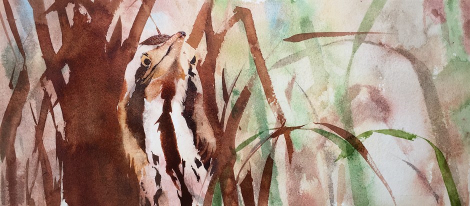 Finally I go back in to the reeds on the left with a deeper tone, using phthalo blue added to the italian burnt sienna. And finding some of the reed shapes with a bit of that old magic negative painting! My original painting now creates a receding backdrop.