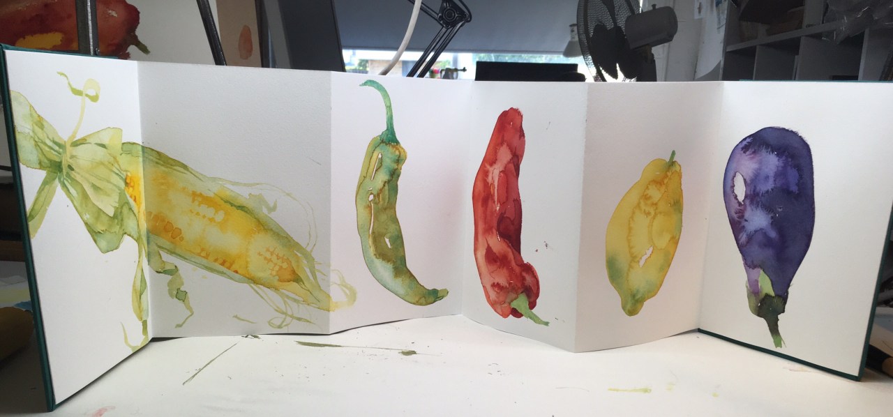 Quick time lapse film of a green chilli, using cobalt teal (PG50) cobalt blue (PB28) and transparent yellow (PY150). Mixed very wet but with plenty of pigment, the shape is painted and then more of the richly mixed puddle of paint is dropped in by touching the loaded brush to the surface, and water from a dropper bottle is added to create lighter areas. The craft dryer allows me to speed the process but also to blow paint away from or into areas that need more/less tone. This specialist dryer blows very gently and very hot (beware of using an ordinary hairdryer on full speed, it will blast your paint in all directions!) As the painting dries to a sheen the added pigment/water spreads in a more controlled way, creating some of those lovely textures, ‘cauliflowers’ etc. The chilli is painted in one of those seductive concertina sketchbooks; this one of watercolour paper from Cass Art