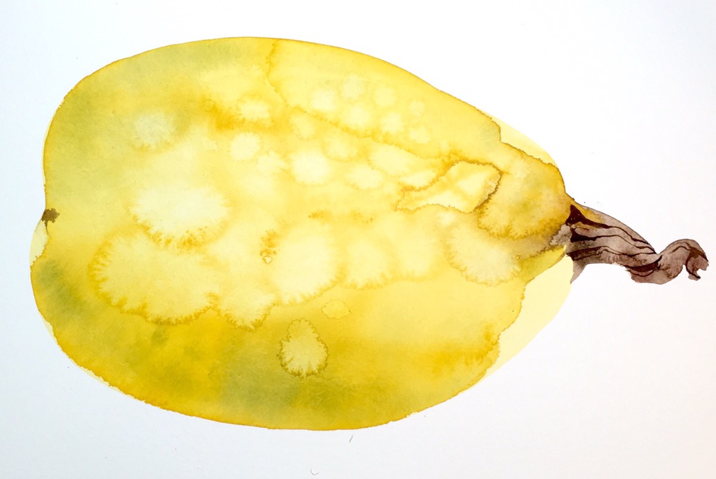 Using transparent yellow (PY150) cadmium yellow (PY35) cobalt blue (PB28) and vandyke brown. Starting with a large makeup brush from the local pound shop, then a favourite Chinese brush from Louise at Oriental Arts and the detail on the stalk done with a sword brush. The spotty texture is created with drops of water applied as the surface goes from shiny wet to damp sheen. I bought this squash from Slindon Pumpkins in West Sussex en route to a teaching weekend at the beautiful West Dean College. It’s become a bit of an annual pilgrimage!