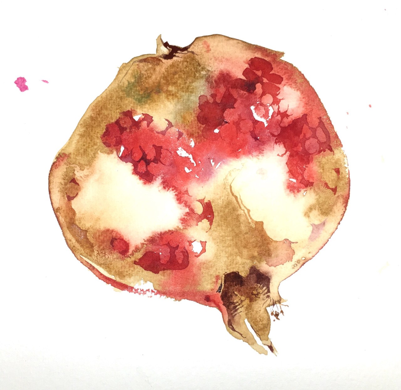 #5MinuteWatercolour Demonstration Pomegranate. Raw sienna, burnt umber, perylene red(PR178), alizarin crimson permanent. Painted with a half inch flat and a Prolene sword brush for the fine details on the seeds and the stamens